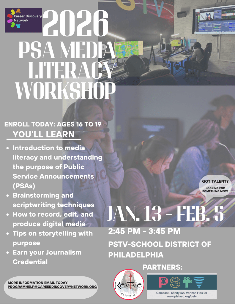 The PSA Media Literacy & Fundamentals of Journalism Workshop is designed to give young people the tools to understand media, tell their stories, and shape narratives that impact their communities. REVIVE Radio + Media partnered with both Career Discovery Network – Greater Philadelphia and The School District of Philadelphia PSTV: Philadelphia’s Student-Run TV Channel, for…